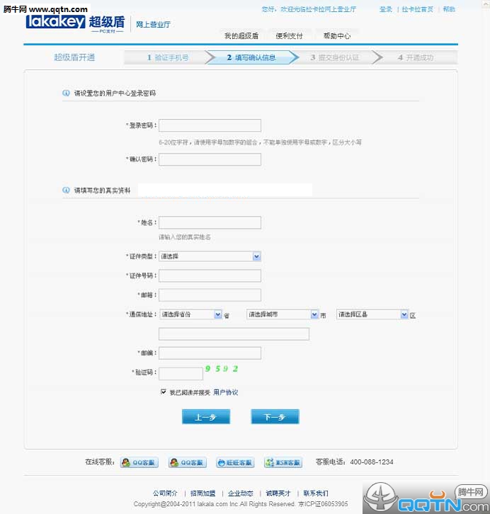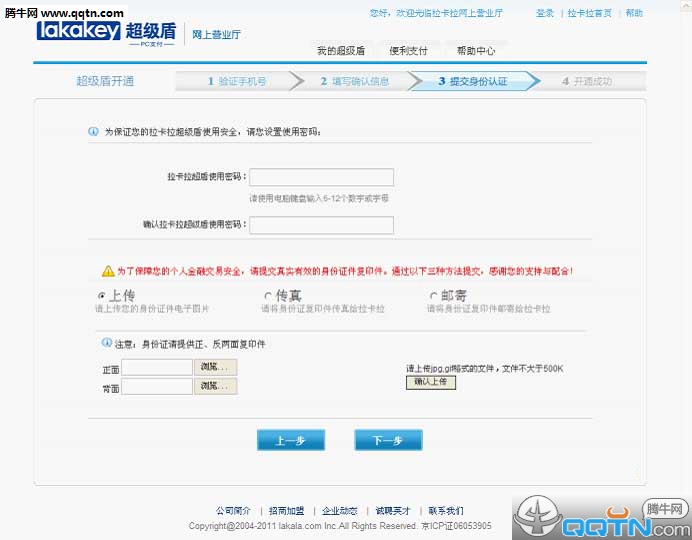 5. 请您设定使用超级盾时的使用密码,并上传身份证的电子版,完成后点击“下一步”按钮,结束超级盾的开通。如需修改注册用户资料,请点击“上一步”返回第二步进行资料修改。(注意:请上传您的身份证正反两面的电子件;若您没有身份证的电子件,可选择通过传真或邮寄方式将复印件发送给拉卡拉;)