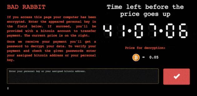 【坏兔子Bad Rabbit】乃一种恶意软件,其能加密受害者电脑中的文件,使得电脑无法正常使用,直至用户支付赎金。该病毒要求受害者支付0.05个比特币(约合275美元),然而目前尚不清楚支付后是否能成功解密电脑文件。此外,若目标在40小时内未支付赎金,黑客将不断提升赎金金额,并通过红色字体在黑色背景上频繁提醒受害者。这一攻击方式与今年6月爆发的NotPetya攻击颇为相似。