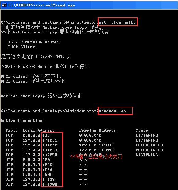 b)如上图假如445端口开启,依次输入以下命令进行关闭: net stop rdr / net stop srv / net stop netbt