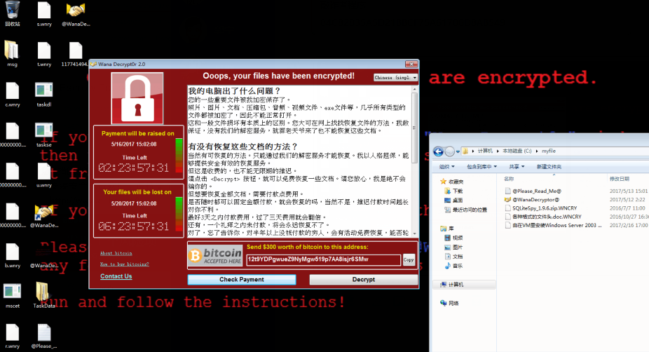 中招系统中的文档、图片、包、影音等常见文件都会被病毒加密,然后向用户勒索高额比特币赎金。WNCRY变种一般勒索价值300~600美金的比特币,而onion变种甚至要求用户支付3个比特币,以目前的比特币行情,折合人民币在3万左右。此类病毒一般使用RSA等非对称算法,没有私钥就无法解密文件。WNCRY敲诈者病毒要求用户在3天内付款,否则解密费用翻倍,并且一周内未付款将删除密钥导致无法恢复。从某种意义上来说这种敲诈者病毒“可防不可解”,需要安全厂商和用户共同加强安全防御措施和意识。