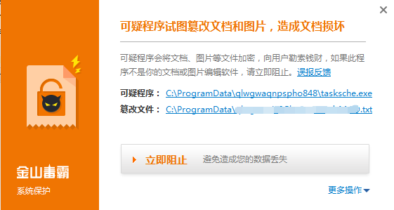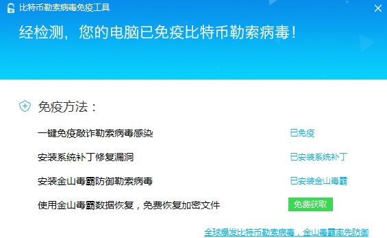 1.安装软件,保持安全防御功能开启。推荐下载安装金山毒霸,我们安全团队已经在第一时间真对该敲诈者蠕虫病毒加强了查杀防御措施。保持毒霸防御开启,即可拦截此次的敲诈者蠕虫攻击。