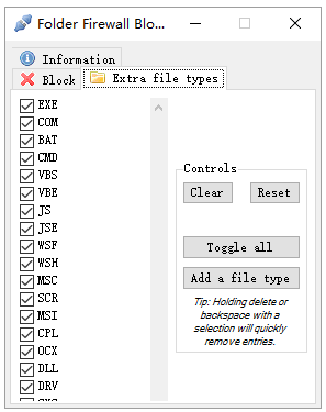 在「Extra file types」中你可以设置要导入规则中的文件后缀,你可以添加其他的文件后缀名。如果你前面没有勾选上「Block extra file types」的话,默认只会为 EXE 格式的文件添加规则,而通过这里则可以合理灵活地为其他格式的文件进行规则的添加。