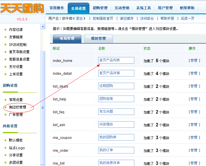 3、侧边栏管理:前台页面右侧显示内容均可自由设置