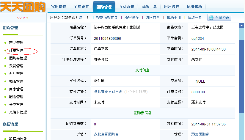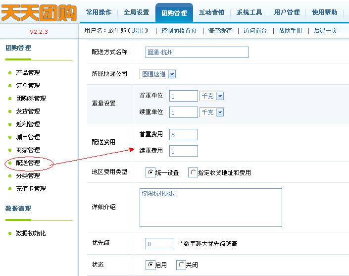 天天团购内嵌与淘宝类似的快递配送功能,支持根据不同城市和快递公司设置差异化价格,能够依据货物重量及区域自动计算运费,亦可实现包邮服务。