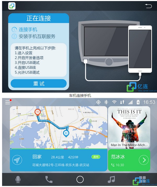 2:如手机端未安装亿连软件,导航仪将为手机自动安装(安装过程需30-60秒,请耐心等待)。成功后将直接进入手机互联状态。