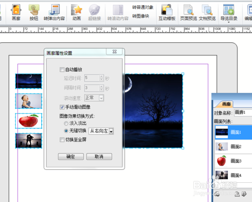点击“属性设置”按钮,弹出对话框,可设置自动播放、手动滑动图像、切换全屏以及淡入淡出等效果。