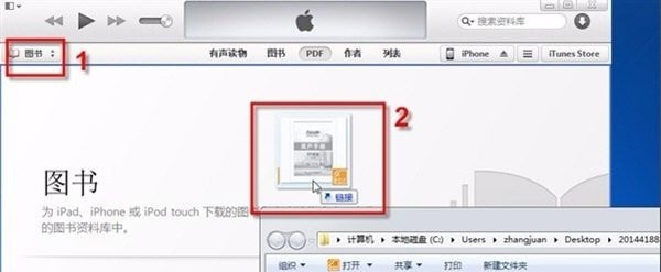 4、点击“图书”按钮,在工具栏上的“文件”中点击“将文件添加到资料库”将pc上事先下载好的图书添加进去或者直接将保存图书的文件夹打开,将下载的图书通过鼠标直接拖曳到iTunes中;