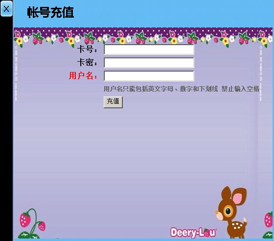 3、给帐号充值,输入卡号和卡密,用户名进行充值;