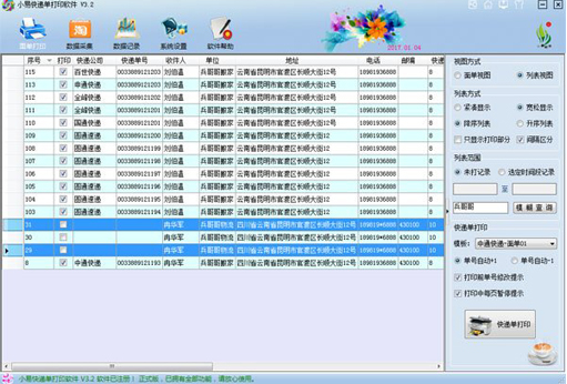 软件支持单打,连打,间隔选定打印,具有面单和列表两种视图,方便打印。能自动增减快递单号,无须过多手工干预。打印数据自动入库,便于进行相应的销售单数,销售额的统计管理。