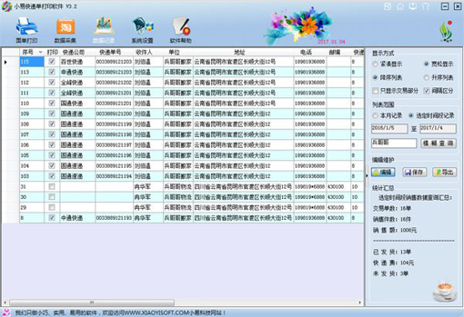 这是对销售打印记录数据进行管理的模块,有别于其它同类软件。对销售打印记录进行分时段(默认按月)进行列表,具有多种列表方式。可对记录进行关键词模糊查询,快速查找所需记录。对数据列表进行销售单数、销售件数、销售额、已打印发货单数、未发货单数、快递费等进行汇总报告。对记录进行备注、修改等编辑操作并保存。所以软件也是方便的数据管理工具。