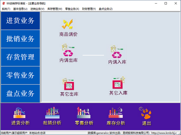 《99进销存管理软件标准版》是一款面向货品流通领域中有进、销、存、财务一体化的中小型企业的管理软件。 软件界面设计简洁,流程人性化,使普通用户不需培训也能很快掌握软件操作使用方法,极易上手。软件操作、功能强大,使企业决策者最关心的往来账款、销售情况、库存存货等信息了如指掌。