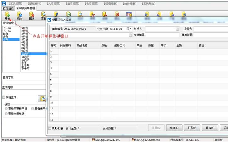 点击采购收货后,再点击“开单”按钮就会出现一张采购收货单的界面,我们根据实际情况录入就可以了,