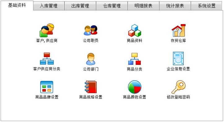 好了,现在整个软件的操作流程就是这样,其实我们理解了这个操作的流程就很简单了,功能虽然多,但是不复杂,只要按照:基础资料》出入库单据》系统报表这个基本的流程来用就可以,无非就是,刚开始安装软件后,我们第一次使用,首先要做好基础资料这里,然后再开始做一些出入库单据,做好了单据好可以看一下库存报表,明细报表,统计报表这些。