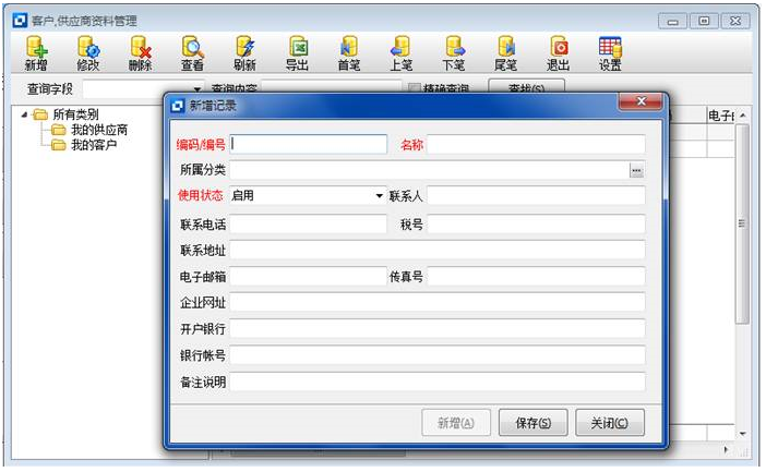这个图的就是基础资料部份,我们依次点击进入每个模块,新增录入即可。我们以客户供应商资料为例,如下图所示: