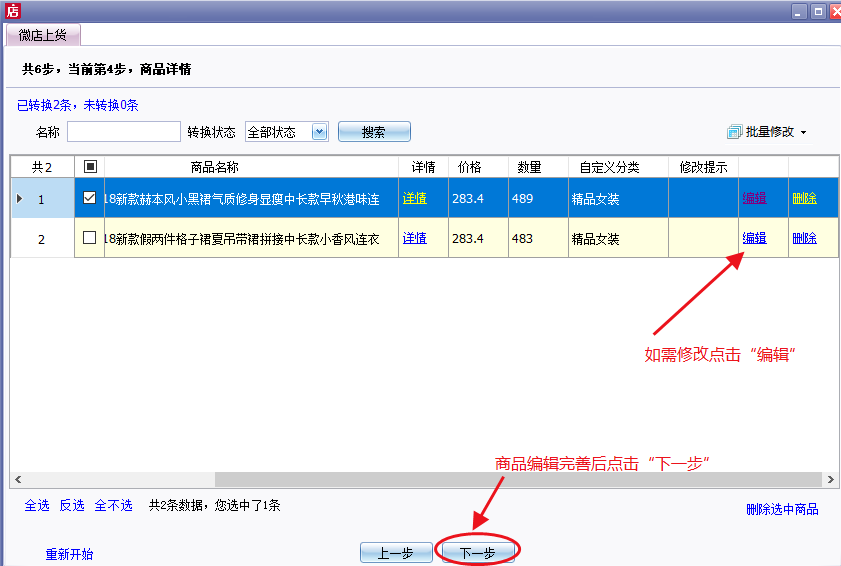 如需对商品做批量修改,可以勾选商品后,点击右上角的“批量修改”,也可点击“编辑”修改单个商品信息,无需修改或修改完成后,点击“下一步”。如下图所示: