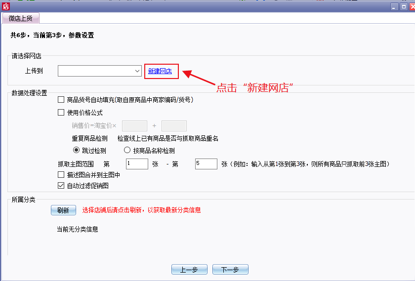 完成店铺授权后,选择要上传的微店店铺,并完善数据处理设置信息,选择商品分类,然后点击“下一步”。如下图所示: