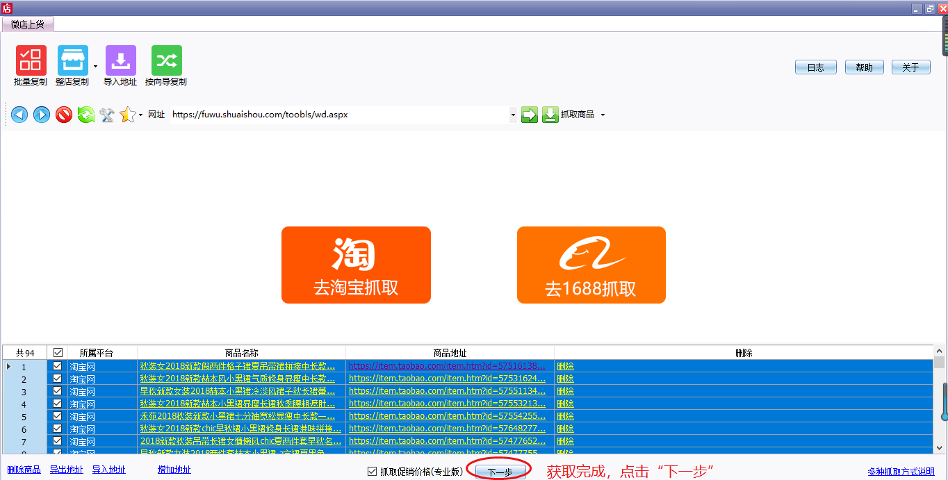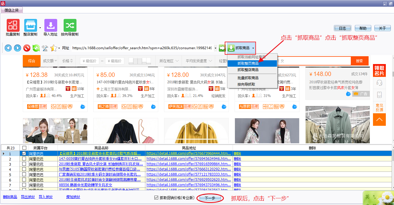 选择自己想要抓取的1688页面商品,点击“抓取商品”,选择“整页抓取”,抓取完点击“下一步”。如下图所示: