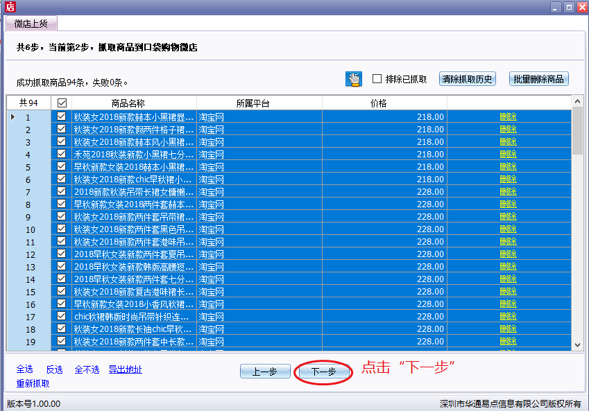 如果不想上传部分商品,可勾选之后点击“批量删除商品”,无需操作或操作完成之后点击“下一步”。