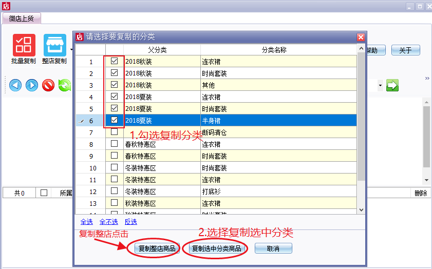 在弹出的店铺分类选框,可直接选择下面的“复制整店商品”,或者勾选部分商品分类,选择“复制选中分类”。如下图所示: