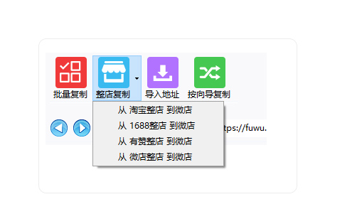 选择“整店复制”并根据要复制的店铺平台选择对应复制方式,这边我们选“从淘宝整店到微店”。如下图所示: