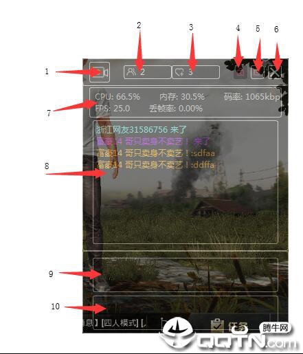 7. 直播参数:显示当前PC的直播参数,包括:CPU、内存、码率、帧数、丢帧率