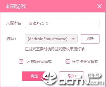 点击“游戏源”,弹出“新建游戏”窗口,修改“来源命名”,在“选择”处选择游戏程序,依据实际情况决定是否勾选“反作弊兼容模式”及“多显卡兼容模式”,最后点击确定。