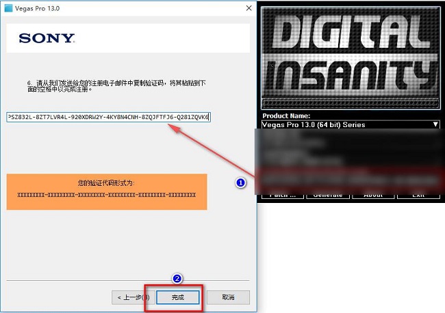 9.然后将注册机上面的”Activation/Authencation Code“一栏序列号复制到软件激活界面,点击”完成“如下图