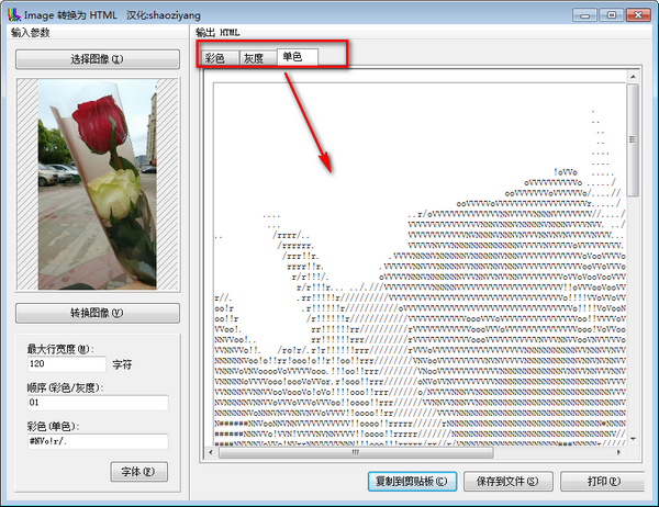 5、ImageHTML可生成三种色彩模式的CII艺术作品:全彩色、灰度及单色。