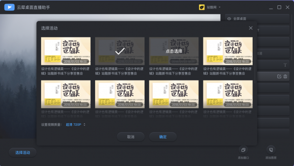 在选择活动后,您可将直播推流至云犀平台指定的活动,支持的分辨率设置包括540P、720P、1080P: