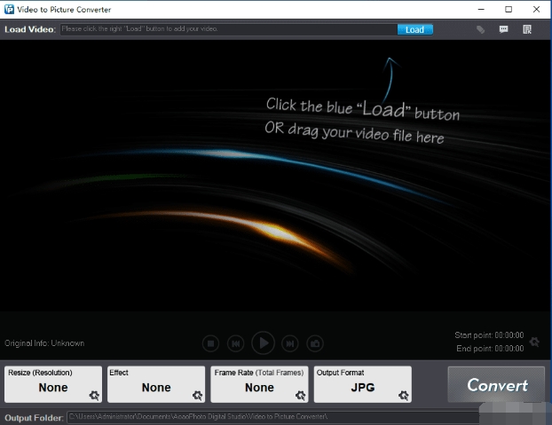 2、打开桌面上的Video to Picture快捷方式,点击load选择需要转换成为图片的视频,这里可以选择AVI,,,MKV,MOV,MP4,3GP,RMVB等视频文件。