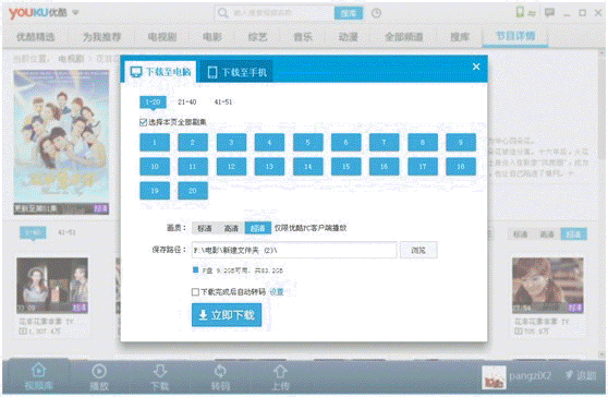 3、进入节目详情页,点击“下载”按钮,可在弹出框内批量选择剧集,选择画质、保存路径等信息后进行下载;