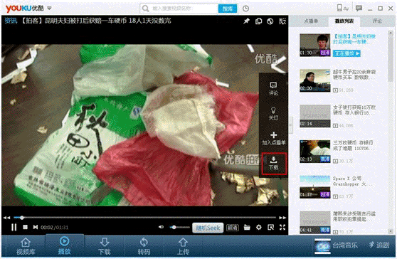 4、在优酷播放页,点击播放器右下角的下载按钮,开始下载;