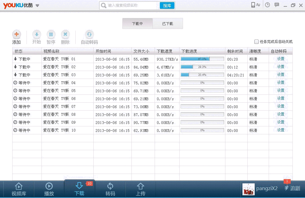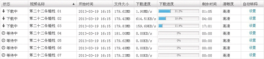 可查看下载任务的下载视频名称、下载进度、下载状态、清晰度、文件大小、下载速度、当前用时及剩余时间、是否自动转码状态提示等信息。