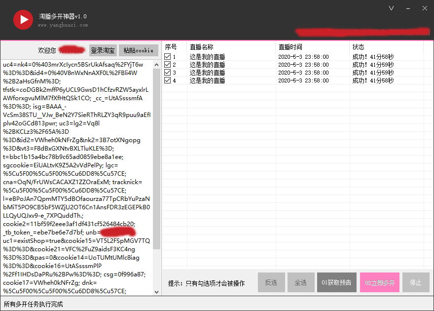 淘播多开神器是一款淘宝直播多条预告同时开播软件,通过技术手段,突破只能同时开播一条直播的限制,本工具可以对多条未开播的预告一键同时在线开播,是淘宝直播间引流的超级神器,有需要的用户不要错过了,欢迎下载使用!