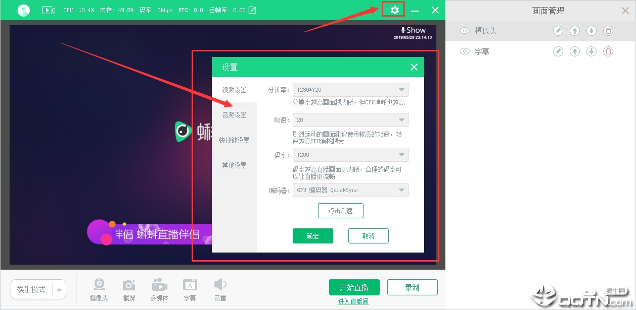 点击右上方的设置按钮,会跳出设置窗口,主播可根据需要对视频的分辨率、帧速和码率进行设置;
