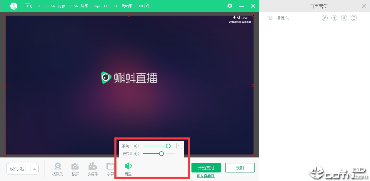 点击下方的音量按钮,可以跳出音量控制条,主播可根据需要设置系统和麦克风对应的音量大小或者静音;