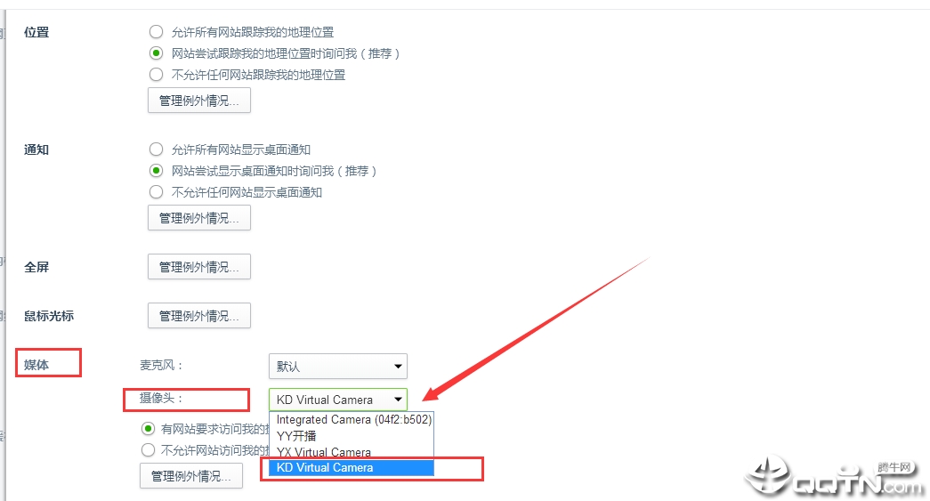 4、当选择虚拟摄像头提示“您的浏览器不兼容,建议更换浏览器”或无法获取到虚拟摄像头时,首先检查浏览器版本是否已经升级到最新版本,然后再选项/设置中选择高级设置-网页内容高级设置-媒体-摄像头选择KD Virtual Camera-刷新直播间即可获取到虚拟摄像头