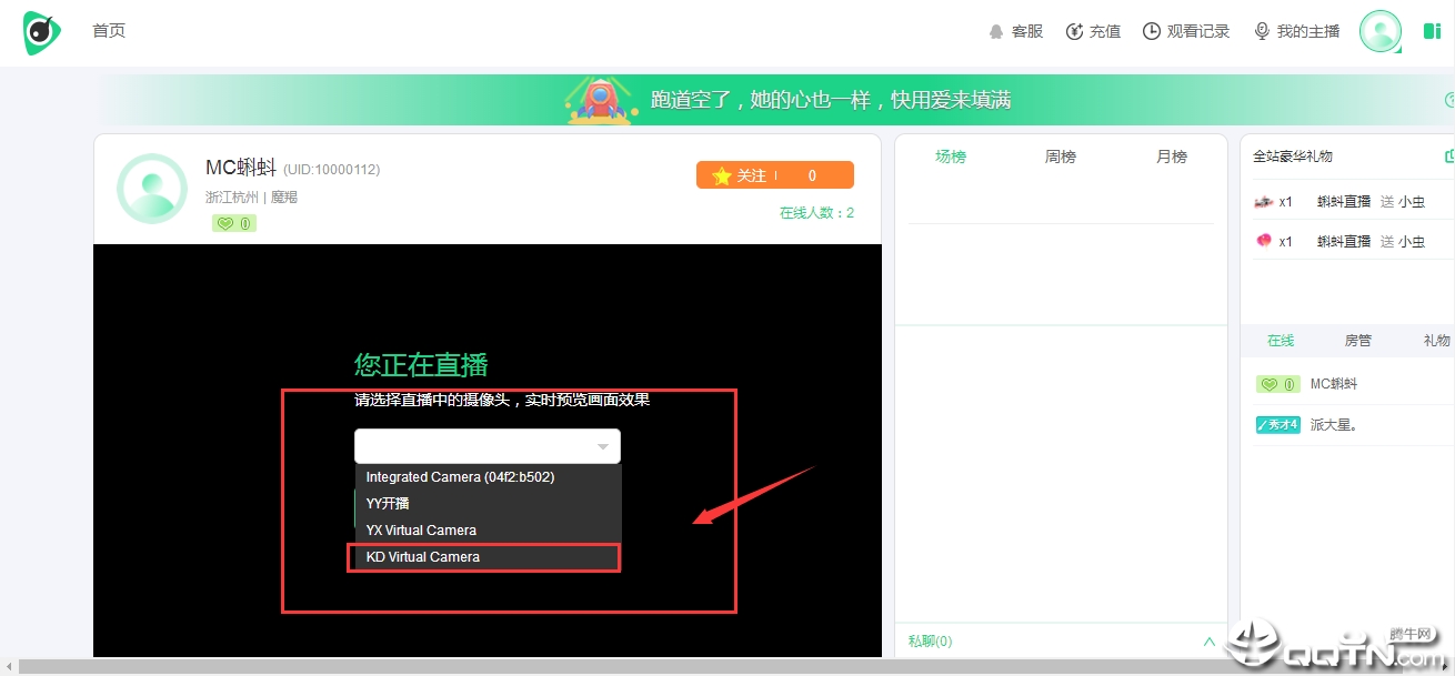 3、此时直播间窗口应该是全屏黑色的,需要主播重新刷新下直播间,正常情况下直播窗口会出现选择虚拟摄像头的浮层,选择“KD Virtual Camera”选项,点击“确定”,网页端设置完成;