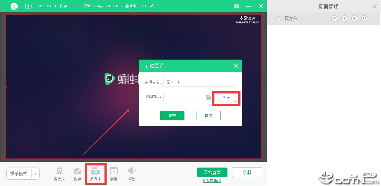 点击下方多媒体按钮,跳出“新建多媒体”窗口,对元素命名之后,点击“打开”,选择图片,最后点击“确认”,图片即可显示在画面预览中,可进行拖动改变图片所在位置;