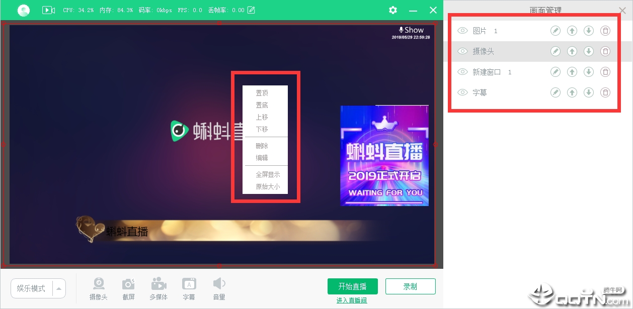 所有添加的画面元素都可在画面管理面板中进行管理,主播可根据需要对画面元素进行层级切换,再次编辑,隐藏和删除等操作,并且在画面预览中选择元素右击也可跳出操作菜单栏可对元素进行置顶、置底、上移、下移、删除、编辑、全屏显示和原始大小操作;