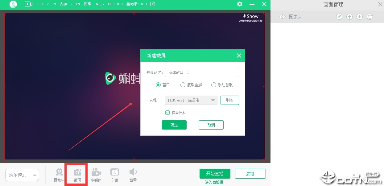 选择“窗口”:可在下方的菜单栏中选择想要获取在直播画面的窗口,可根据需要勾选“捕获鼠标”功能;
