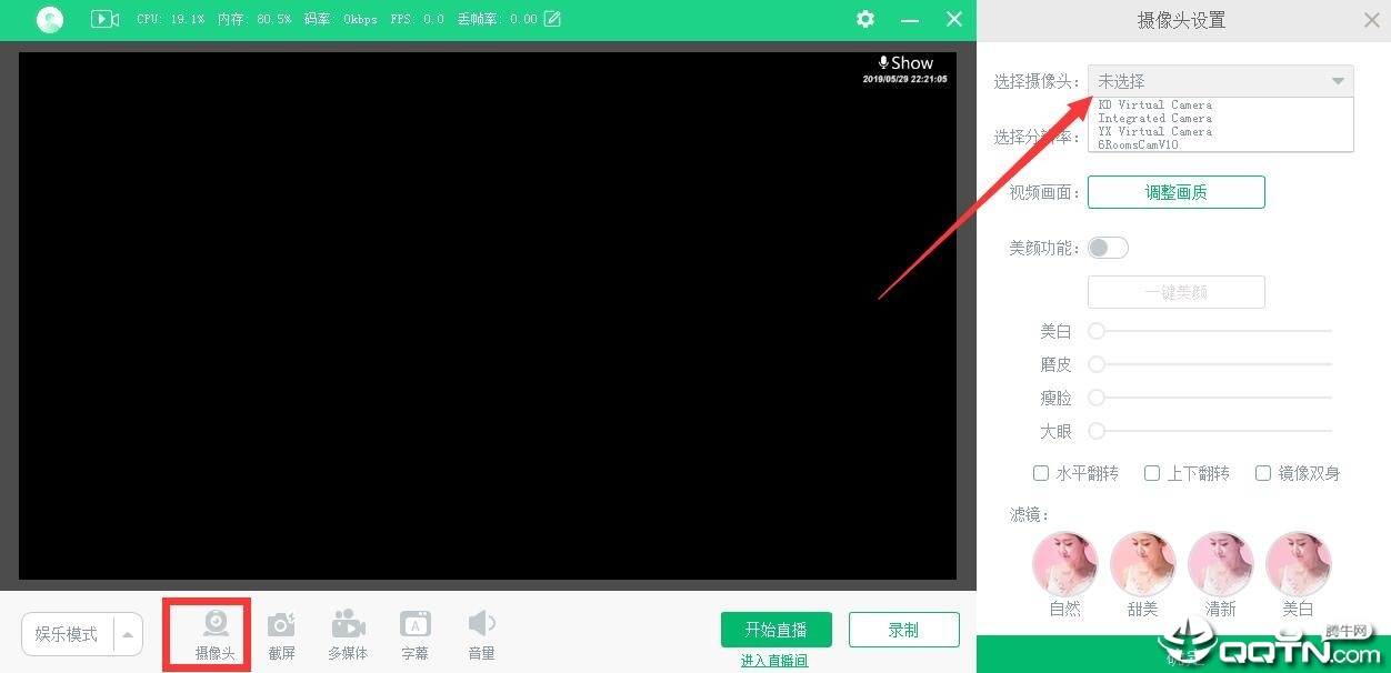 点击下方的“摄像头”按钮,出现右侧的摄像头设置面板;