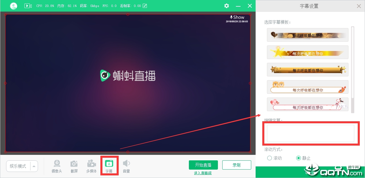 点击下方字幕按钮,跳出“新建文本”窗口,对元素命名之后,可以编辑字幕,并对字幕进行模板设置、滚动方式设置,设置完成之后点击“确定”,字幕即可显示在画面预览中;