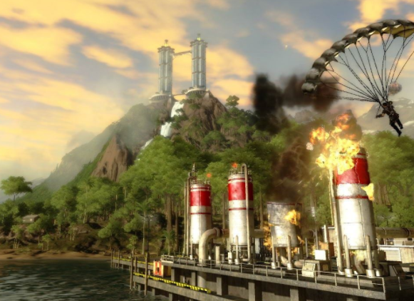 画面表现9.0分:Rico的人物模型看上去很棒,但是在整个《正当防卫2》中画面最优秀的地方还是Panau岛。