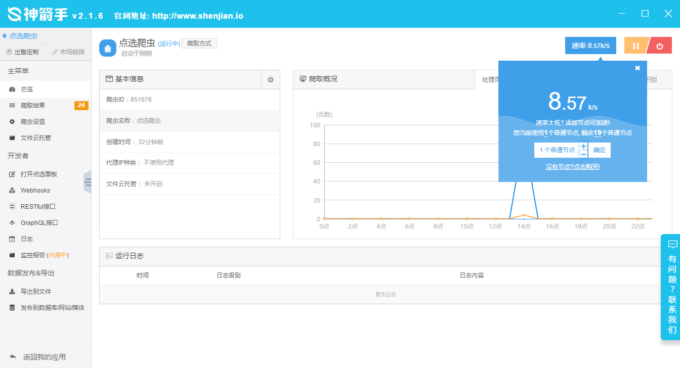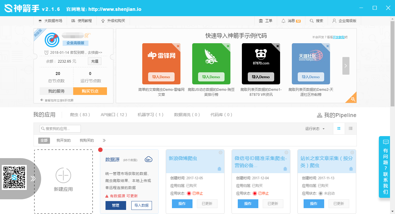 神箭手云客户端是一个集大数据与人工智能于一体的云操作系统,用户可以在神箭手上迅速开发大数据和AI应用,包括爬虫、机器学习、数据清洗及API接口等。神箭手作为云服务,所有操作均可在登录网站后进行。同时,神箭手亦提供了客户端软件,以便利于习惯于软件操作的用户。神箭手客户端的账户、功能与体验均与网站保持同步。此外,通过客户端导出数据至本地文件的速度更快且更为稳定;客户端还新增了可视化点选自动生成爬虫代码的功能,适合不具备编程能力的用户自定义爬虫。