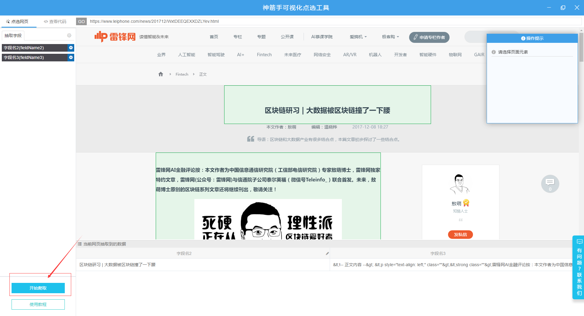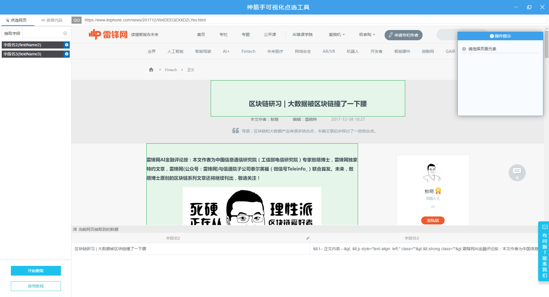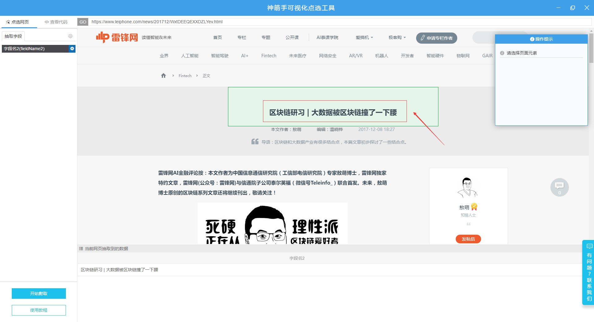 首先,输入一个包含所需数据的URL(例如 https://www.leiphone.com/news/201712/WxtDEEQEXXDZLYev.html),回车加载显示内容: