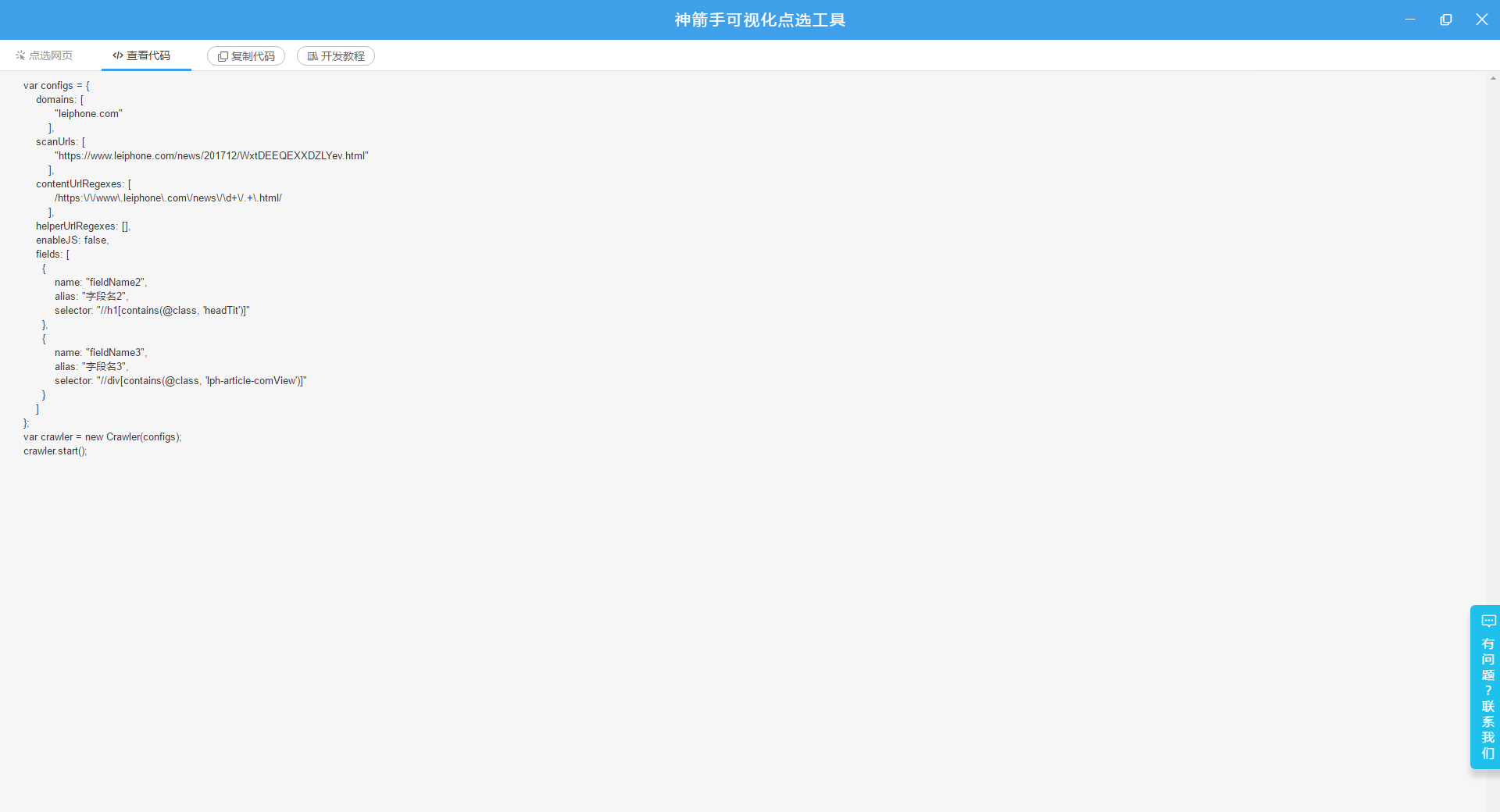 1、点击点选面板的查看代码,您可以随时查看点选自动生成的爬虫代码,亦可将代码拷贝到编程模式的爬虫内,进行二次开发