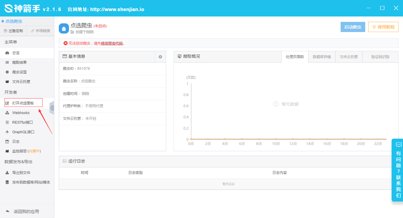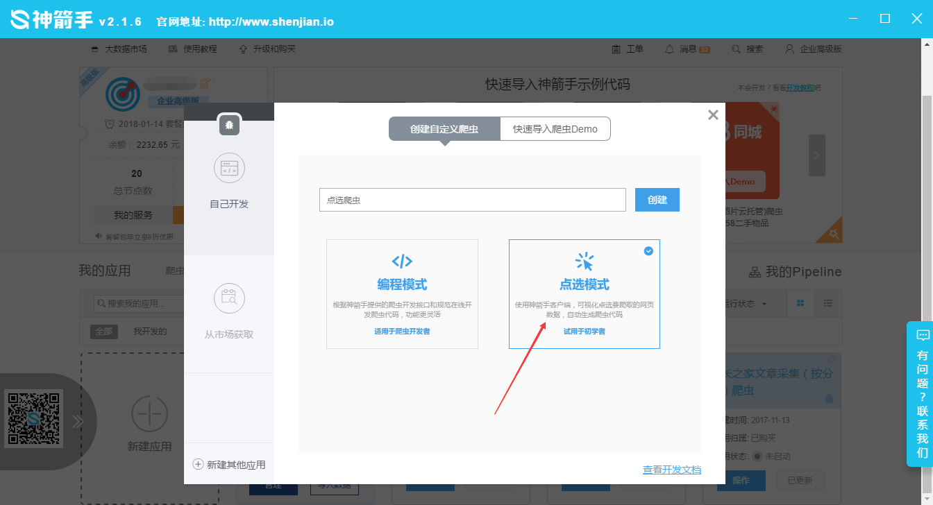 点击 “新建应用” > 选择 “爬虫”,点击 “下一步” > 选择 “自己开发” > 选择 “点选模式”。输入爬虫名称后,点击”创建”