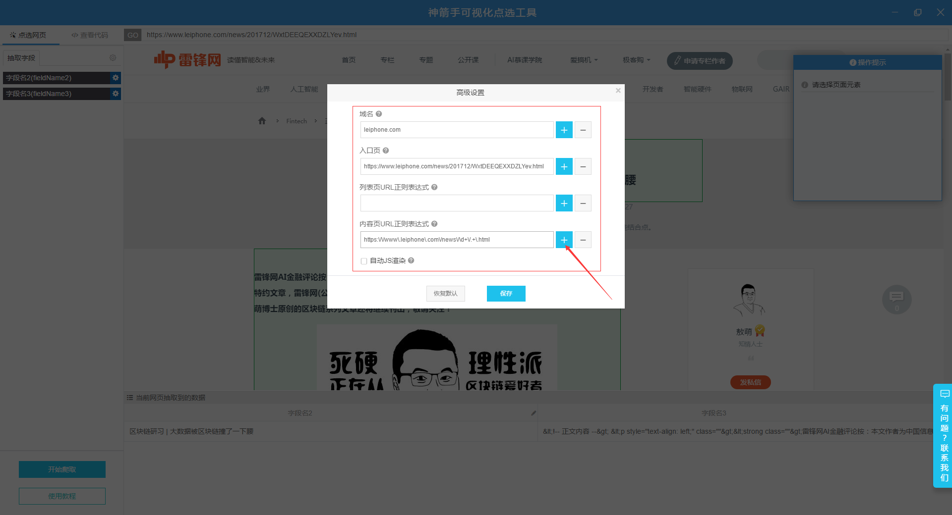 点击左侧的高级设置,可以设定爬虫的列表页、内容页URL正则表达式、是否自动JS渲染等,以提升爬虫效率: