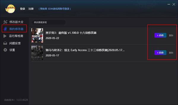 5、在我的修改器中,能够快速找到已下载的修改器资源,同时可进行搜索、启动、删除等操作;
